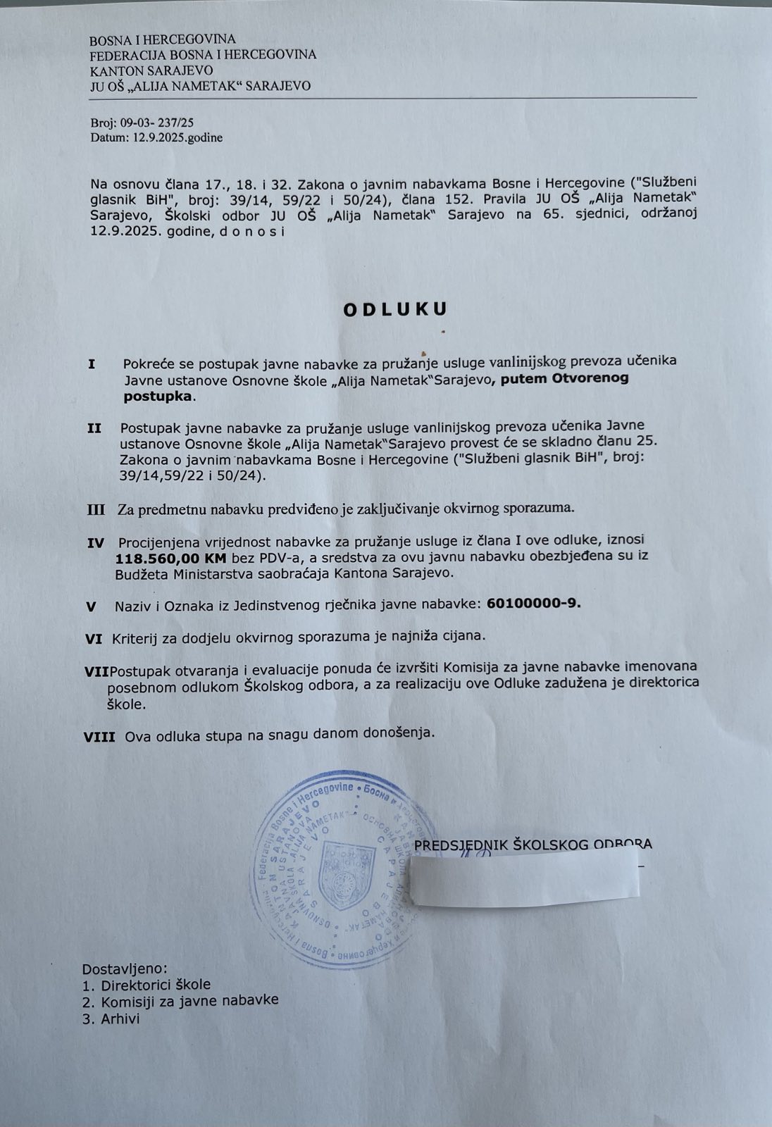 - Odluka o pokretanju javne nabavke – Prevoz učenika