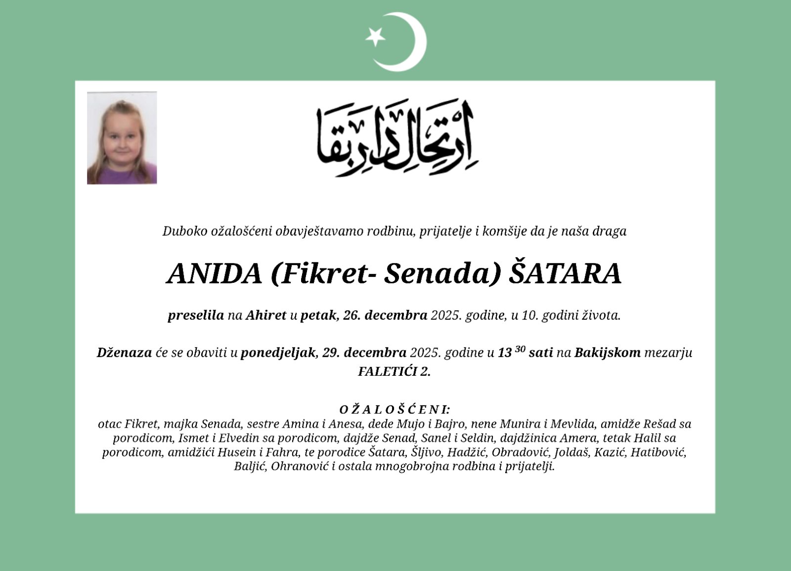 S neizmjernom tugom opraštamo se od naše drage Anide Šatare, učenice IV razreda, čiji je život prerano ugašen. Iako je njen boravak među nama bio kratak, ostavila je neizbrisiv trag dobrote, topline i dječije iskrenosti u našim srcima.